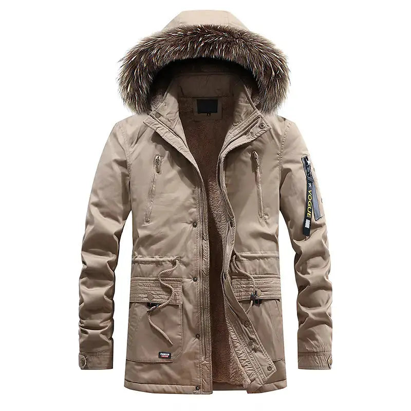 Experience the ultimate in comfort and style with our men's hooded fleece-lined cotton jacket. Crafted from 100% pure cotton, this mid-length down jacket is not only durable but also incredibly soft against the skin, ensuring you stay cozy throughout the day. The interior is lined with 100% polyester, providing an extra layer of warmth that makes it perfect for chilly weather.